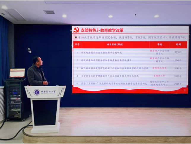 姬军鹏主任做了《电气工程实验中心党支部建设及实验教学工作经验》主题报告。“实验教学是课堂教学改革的利器,将课程思政有机融入实践课程,强化实践过程的课程思政建设,优化实验育人体系,教育引导广大学生厚植爱党爱国情感,坚定为党为国奋斗的信念,是实验中心全体教师秉承的初心。”姬军鹏主任说道。电气工程实验中心党支部坚持以行业难题为导向、培养应用型创新人才为目标,积极探索电气+新工科人才培养模式,推进虚拟仿真与实验教学的深度融合,为增强学生实践能力,提高人才培养水平提供了优质教育资源。