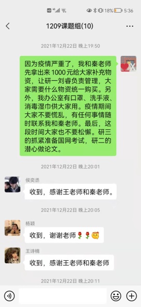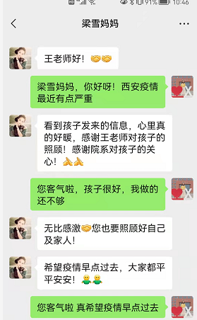 封城当天晚上,王倩老师与指导研究生的家长逐一联系,请家长们放心,学生家长看到老师发的消息后,感觉非常暖心,表示我们“家校联动”,疫情更能尽快解除。