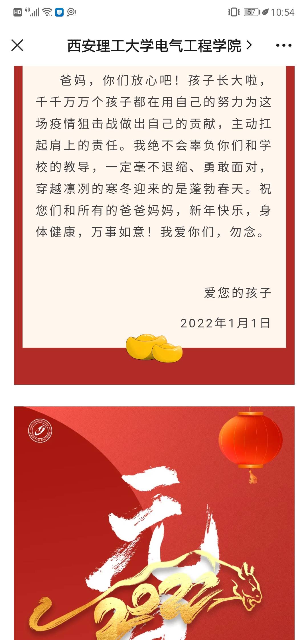 在严峻的疫情防控形势下,研究生的心里疏导至关重要。2022年的第一天,因疫情的“封锁”,万千西安学子只能“制动”在宿舍,最关心、牵挂、思念他们的无不外乎是他们自己的父母。为此,学院在新年第一天,特别发起了专题活动“爸妈,新年好”,制作了推文并录制了视频,向无法在这个新年陪伴他们的父母展现在校健康、稳定的生活,也传达学子们对父母、家人的祝福。