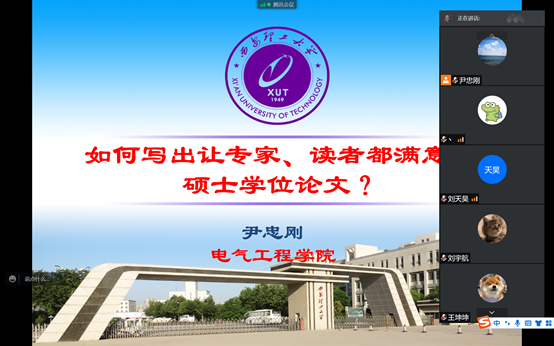 2022年3月14日晚上,电气工程学院副院长尹忠刚教授为我院硕士研究生做了“如何写出让专家、读者都满意的硕士学位论文?”专题讲座,在校研究生以及相关管理人员共300余人听取了线上报告。