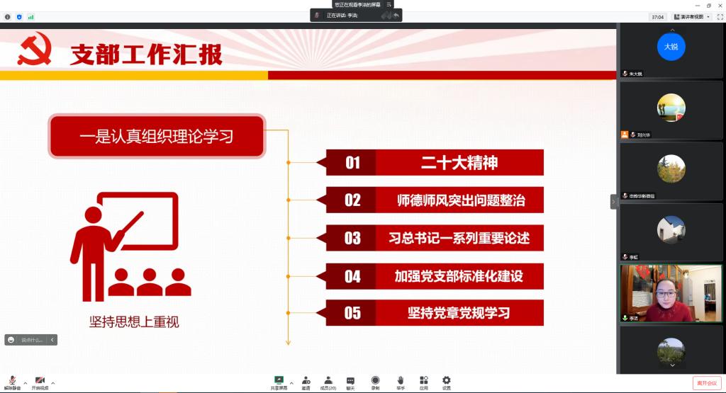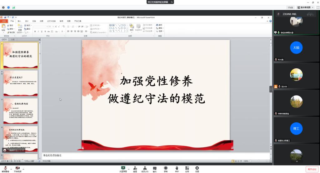 院党委书记李虹做了“加强党性修养,做遵纪守法的模范为题的党规党纪专题报告,分别从党纪的内容:政治纪律、组织纪律、群众纪律、工作纪律和生活纪律五个方面以及党的纪律处分条例做了专题报告,并结合学校作风建设年和师德师风突出问题专项整治,希望电网系全体教师教学同时注重育人工作,对学生做积极健康引导,高水准严要求做四有好老师。电网系党支部书记李洁从支部工作情况,电网系支部与咸阳供电公司互联网支部结对共建情况、疫情面前电网系党员的勇于担当进行了介绍并带领大家学习领悟二十大报告重要精神,要求全体党员同志提高政治站位,充分认识党的二十大重要意义。之后,副主任马文涛、杨磊老师分别对电网系常规教学工作和科研工作进行了详细介绍。