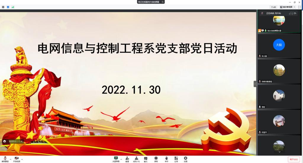 11月30日下午,电气工程学院电网信息与控制工程系党支部以腾讯会议的形式召开“加强党性修养,做遵纪守法的模范”主题党日活动及二十大精神学习专题的线上党日活动。副校长申烨华、院党委书记李虹、院党委副书记何海生和电网系全体教师参加,会议由电网系主任刘兴华主持。