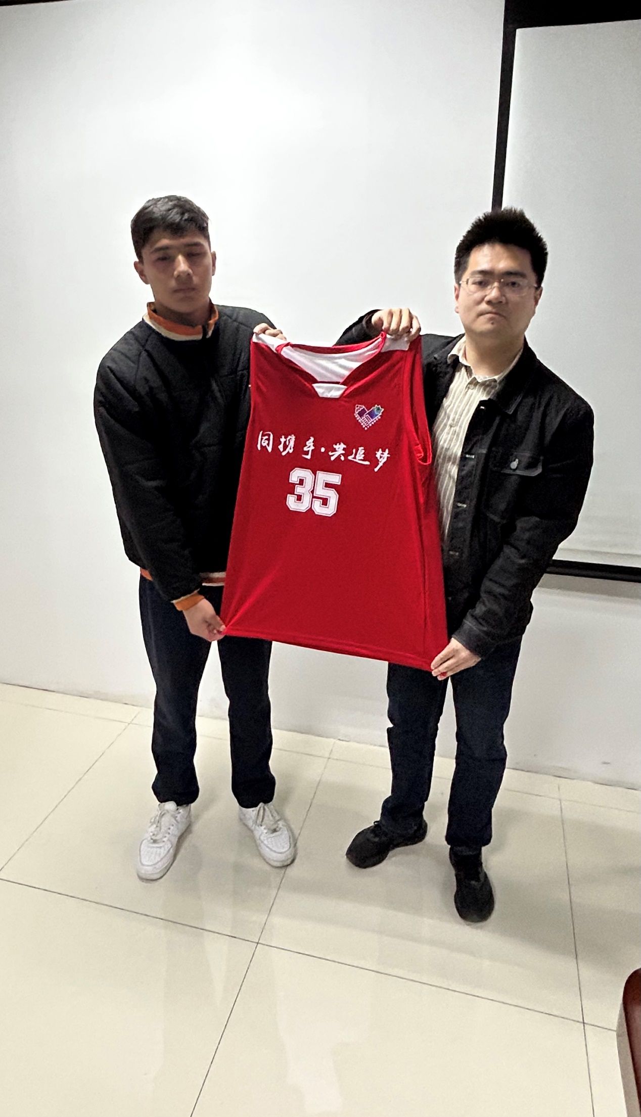 民族管理中心教师孟庆龙为各民族学生联合篮球队队员赠送篮球队服。他表示,民族管理中心重视各民族学生的体育锻炼发展,成立篮球队是一件好事,希望各民族学生联合篮球队积极推动学校各民族学生之间的体育交流。