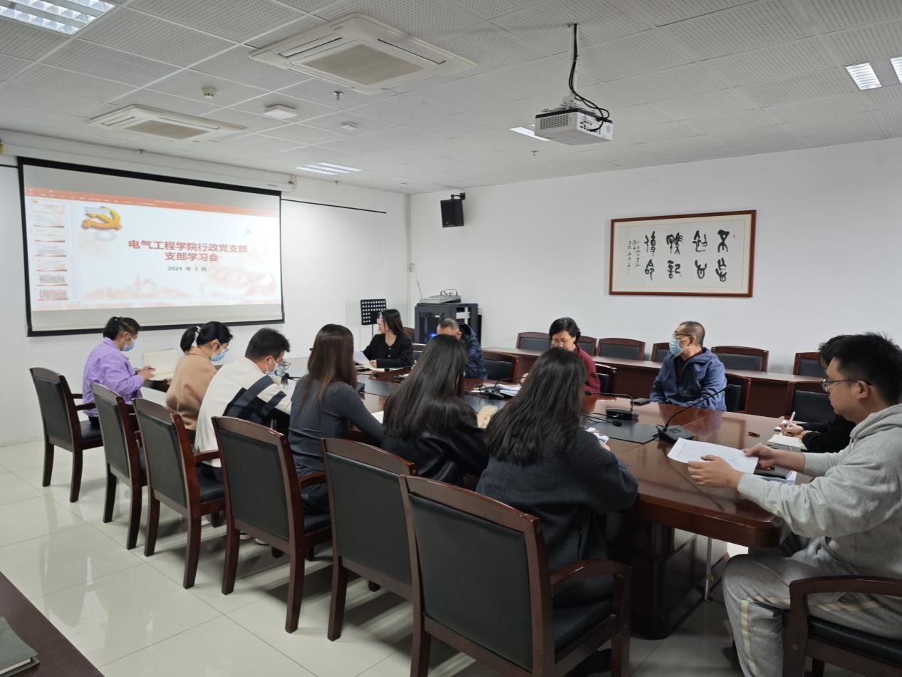3月26日下午,电气工程学院行政党支部在综合楼1211会议室召开支部党员学习会,集中学习2024年全国“两会”精神及学校工作会议精神。会议由支部书记许红主持,全体支部党员参加。