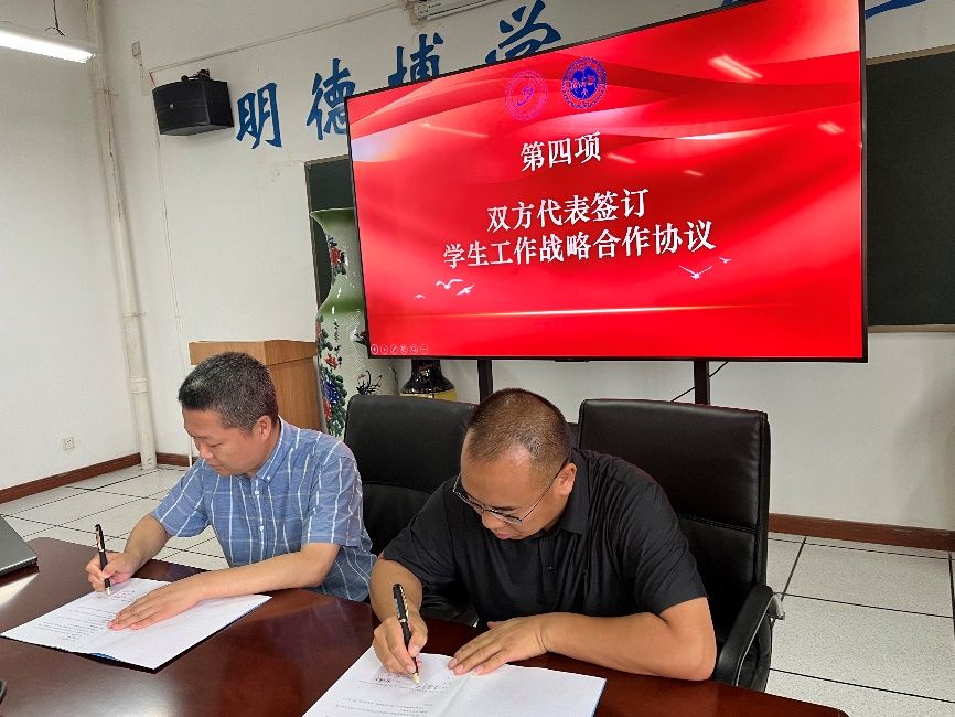 王利军对电气工程学院一行的到来表示热烈欢迎,何海生和王利军分别立足于学院学科特色、学生培养以及辅导员队伍建设等方面进行了简要介绍,一致表达出对此次合作的期待。随后,电气工程学院学工办主任巩晶骐对合作协议内容进行了解读,双方就学生管理、科创比赛、学生就业等方面达成战略合作。