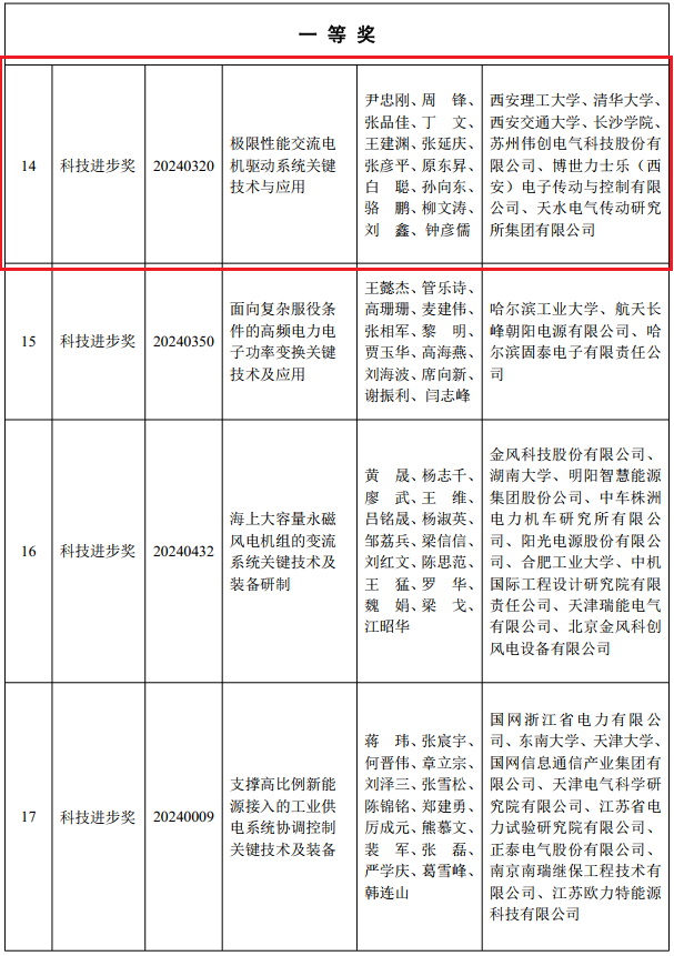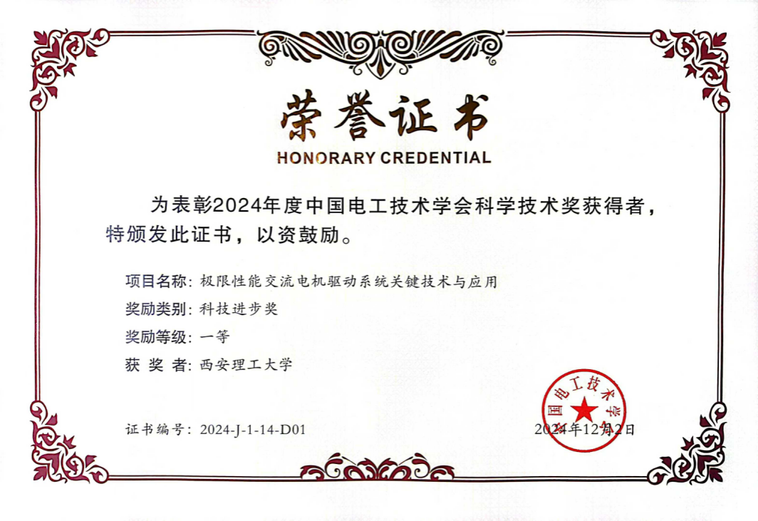 其中,电气工程学院尹忠刚教授主持的《极限性能交流电机驱动系统关键技术与应用》项目荣获2024年度中国电工技术学会科学技术奖一等奖