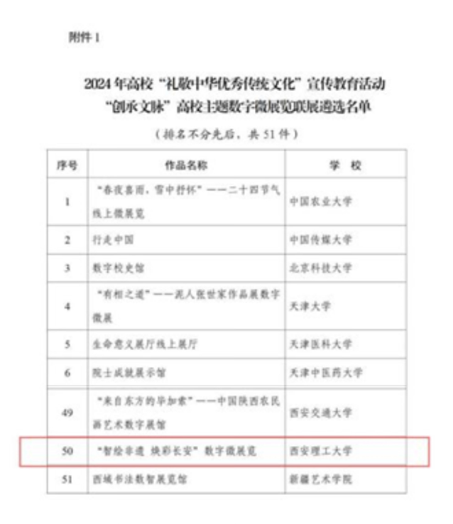 根据《教育部办公厅关于举办2024年高校“礼敬中华优秀传统文化”宣传教育活动的通知》(教思政厅函[2024]10号)要求,经学校推荐、专家遴选,我院报送的《“智绘非遗 焕彩长安”数字微展览》获选2024年高校“礼敬中华优秀传统文化”宣传教育活动成果。据悉,此次宣传教育成果是我校首次在全国高校“礼敬中华优秀传统文化”活动中获得荣誉。