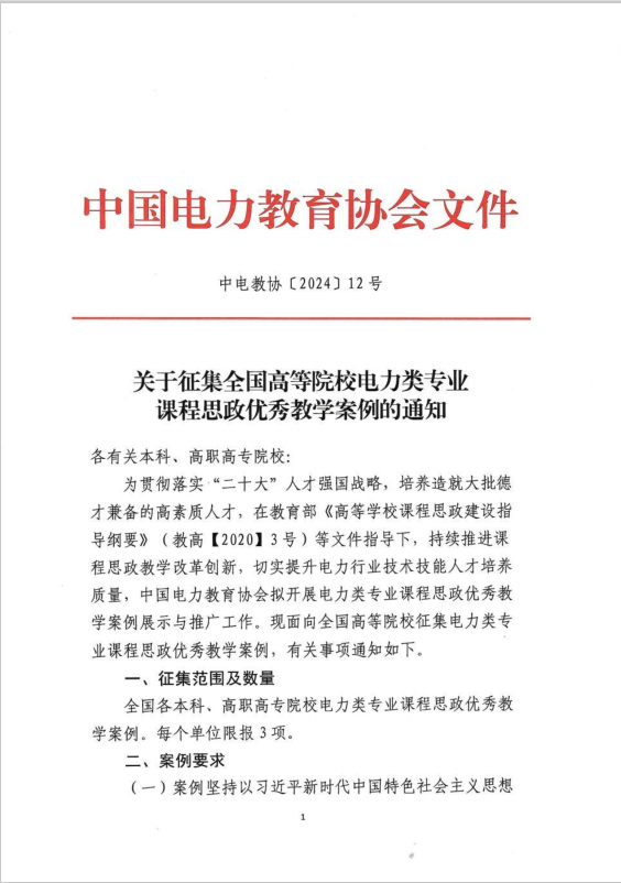 电力行业高等院校电力类专业课程思政成果教学案例征集与推广活动由中国电力教育协会组织,旨在持续推进课程思政教学改革创新,切实提升电力行业技术技能人才培养质量,培养造就大批德才兼备的高素质人才。此次共有104个课程思政教学案例参与遴选,经过专家评审,15个本科组成果案例被遴选为优秀教学案例。