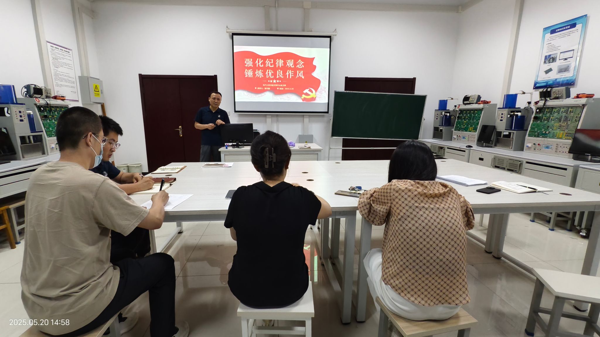 为进一步强化纪律作风建设,推动中央八项规定精神在教育教学工作中落地生根,2025年5月20日,电气工程学院实验中心党支部组织全体教职工开展主题党日活动。本次活动通过专题党课、文件研学、案例警示等多种形式,系统学习中央八项规定精神及相关要求,着力锤炼新时代师德师风,营造风清气正的校园生态。