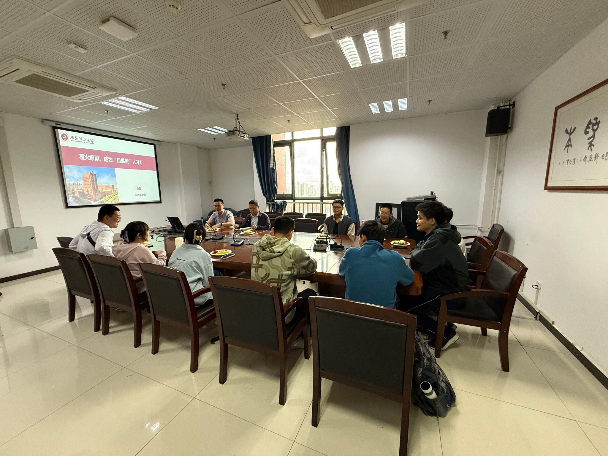 会上,10名“拔尖创新班”新生依次作自我介绍,展望大学生活。杨磊为同学们作了题为“星火燎原,成为‘自然型’人才”的主题报告。杨老师结合自身经历,从学习、科研和生活三方面分享经验,鼓励大家养成每月读一本书的好习惯,坚持“每天运动一小时,为国奋斗五十年”。杨磊老师鼓励大家“从大处着眼,从小处着手”,从大一开始就进导师课题组开始学术熏陶。激励大家以自身优势为基础勇于攀登、勇于创新,做一名敢于争先的西理工电气人。