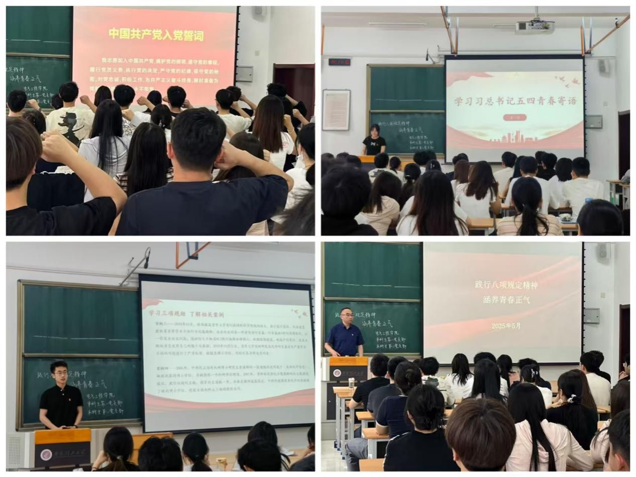 为进一步深入贯彻中央八项规定精神学习教育,弘扬五四精神、传承红色基因,激发青年党员的使命感与责任感,我院本科生第一、第二党支部于5月14日在综合楼联合开展“践行八项规定精神,涵养青春正气”主题党日活动,副处级组织员王海生讲授专题党课。